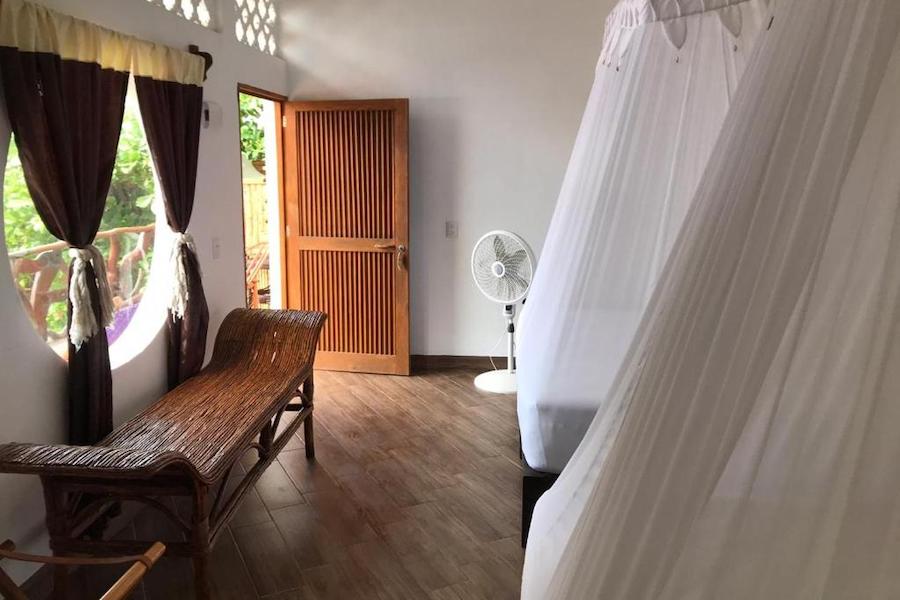 1 cama king size, terraza privada con deck de madera, ventilador de techo, baño privado, caja de seguridad y guarda ropa, amenities y botellas de agua para dos personas.